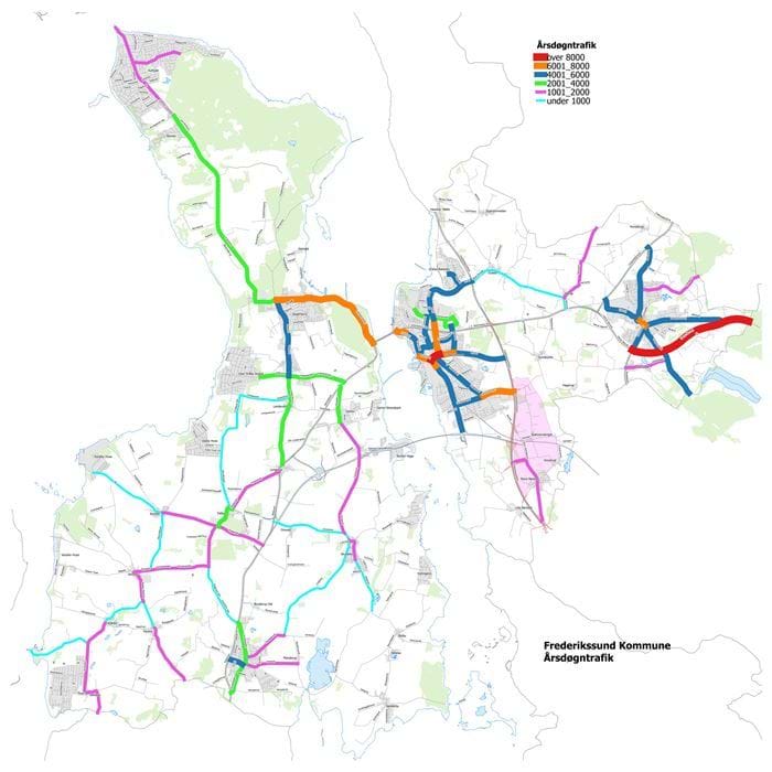 Årsdøgntrafik-kort over Frederikssund Kommune. Årsdøgntrafik angiver det gennemsnitlige antal køretøjer, som kører på en strækning på et døgn. I kortet er de forskellige årsdøgntrafik-intervaller inddelt i forskellige farver og tykkelser.